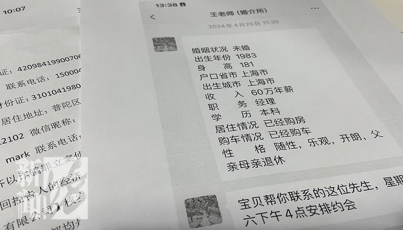 她还透露,给条件不算好的客户匹配对象时,他们甚至还会直接去公园街头找一些同样条件不佳的人,让两人联系。“比如说这个男的没有学历,也没有房子,三无产品,但是我们这里的会员都是硕士,根本就匹配不上,有的时候就是公园里面这种人家挂牌子、摆摊头的,有电话号码,这种女的条件也很差的,保姆或者什么,有电话号码我们去打电话,然后把她叫来跟他约会,你说这种女的她也不要付钱介绍费,你这种男的值得她付钱吗?不值得她付钱。”