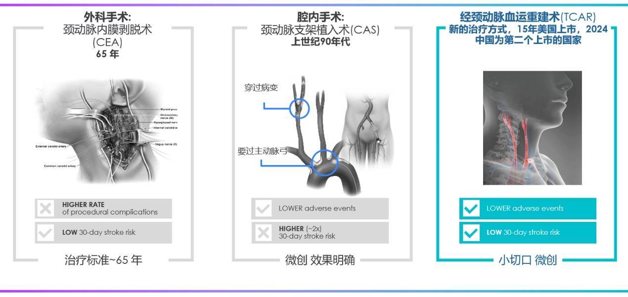 r更安全(卒中风险<1.5%):逆流脑保护+不过弓、围手术期脑梗风险显著低于传统CEA内膜剥脱和支架植入(CAS)。