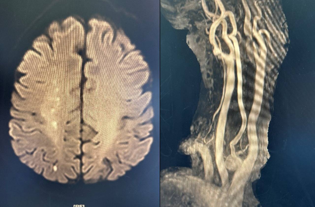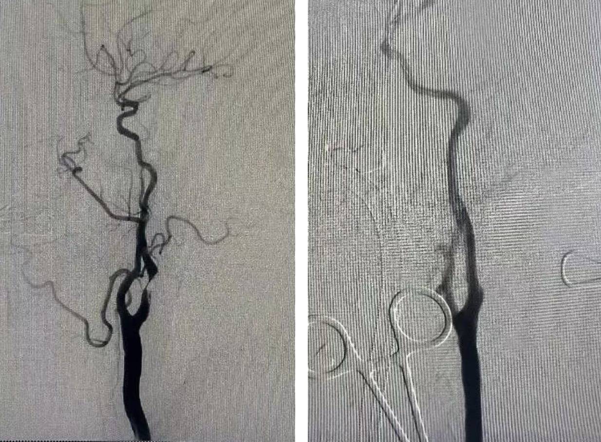 r患者因发作性左手无力来潍坊市中医院东院区脑病重症急救科就诊。患者既往有高血压病、糖尿病病史多年,检查后发现右侧大脑半球分水岭梗死、右侧颈内动脉重度狭窄伴不稳定溃疡斑块、合并多种基础疾病、弓形不佳,常规手术(CEA和T-FCAS)发生栓子逃逸导致颅内栓塞风险相对较高。